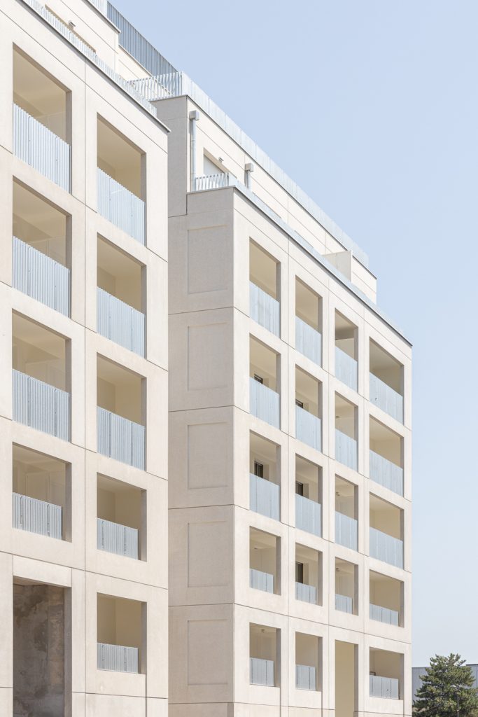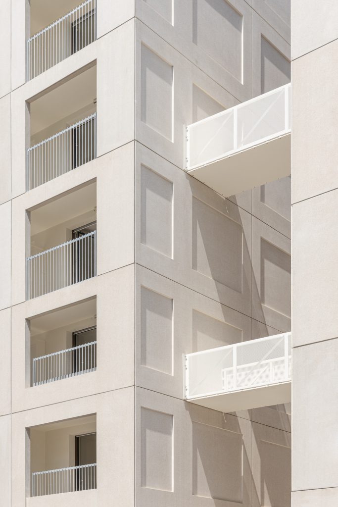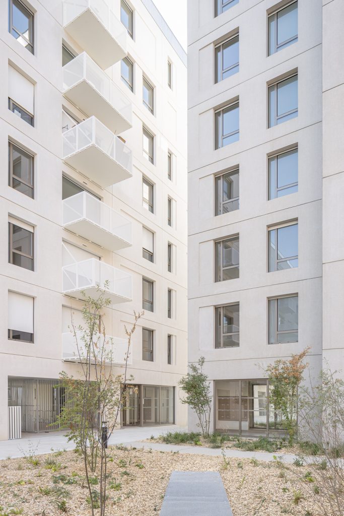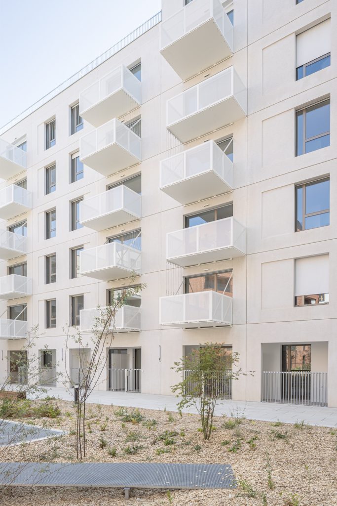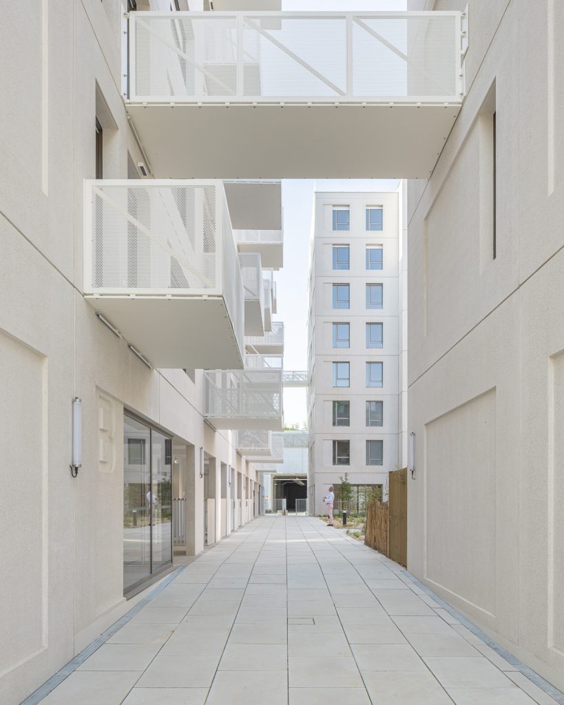 L’apparente simplicité des façades met néanmoins en évidence des balcons venant animer la faille, tantôt suspendus tantôt traversant la faille dans son intégralité. Cette dernière est mise en avant par l’usage d’un béton préfabriqué ton blanc contrastant avec le béton préfabriqué ton gris clair du reste de l’opération. Cette particularité est également lisible dans le traitement des sols extérieurs.