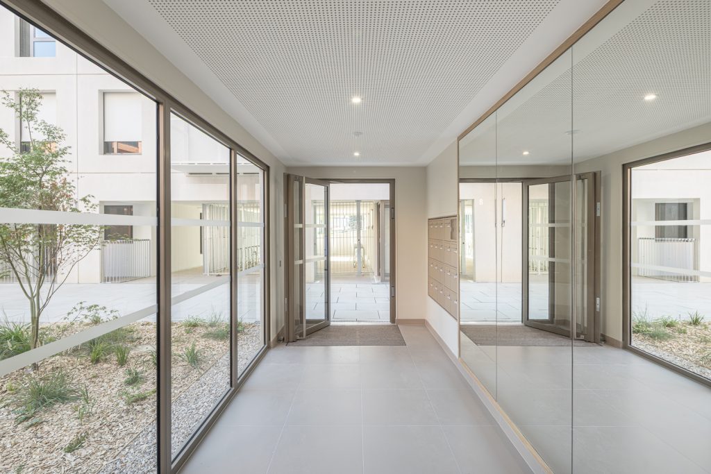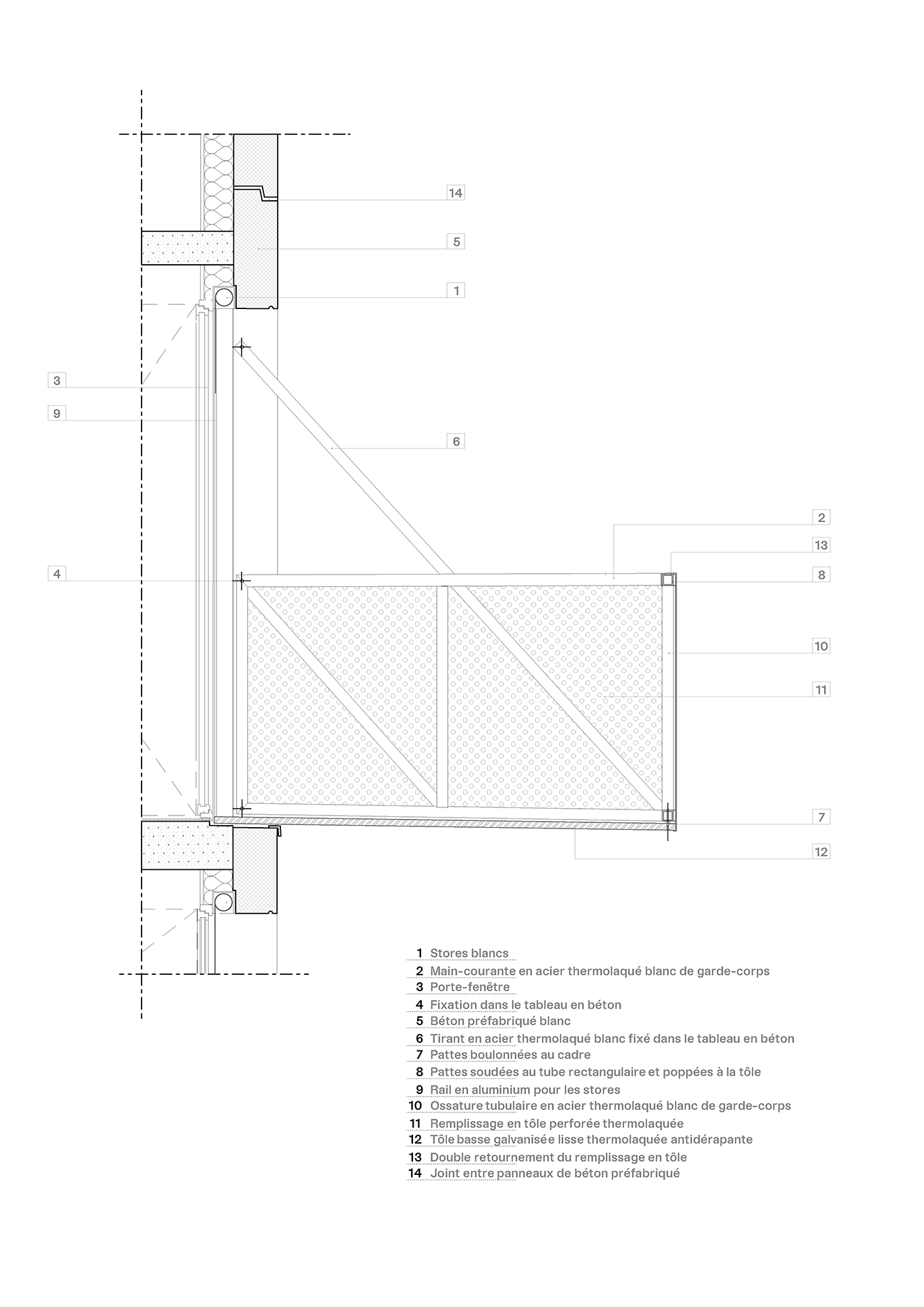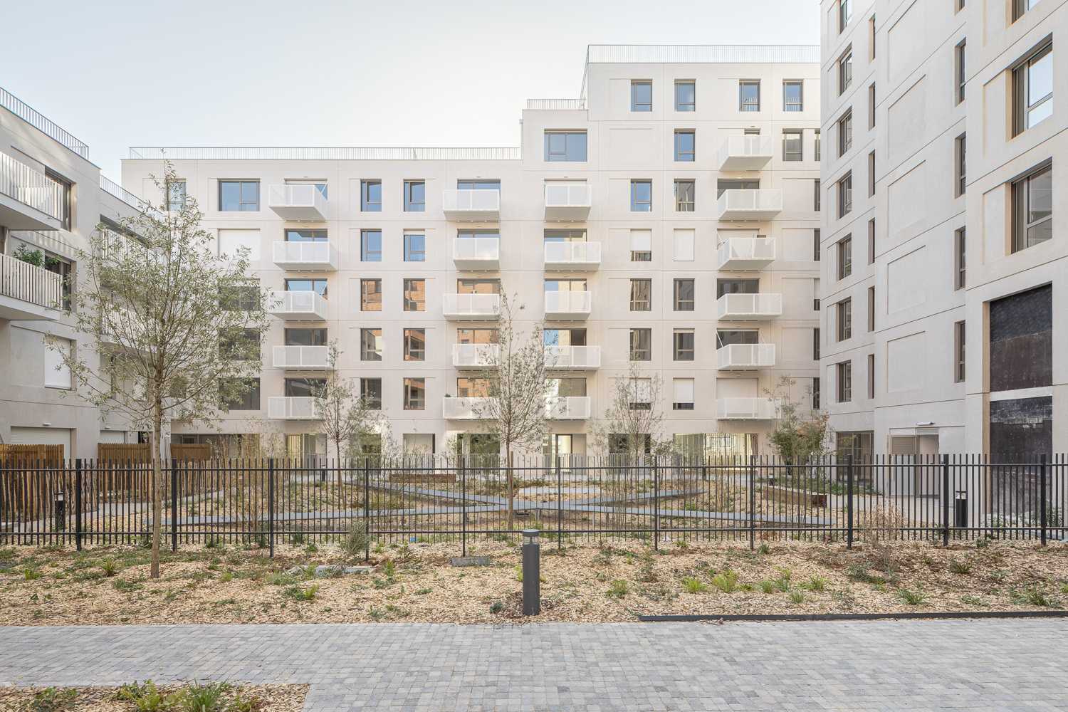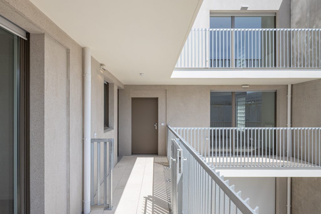 L’apparente simplicité des façades met néanmoins en évidence des balcons venant animer la faille, tantôt suspendus tantôt traversant la faille dans son intégralité. Cette dernière est mise en avant par l’usage d’un béton préfabriqué ton blanc contrastant avec le béton préfabriqué ton gris clair du reste de l’opération. Cette particularité est également lisible dans le traitement des sols extérieurs.