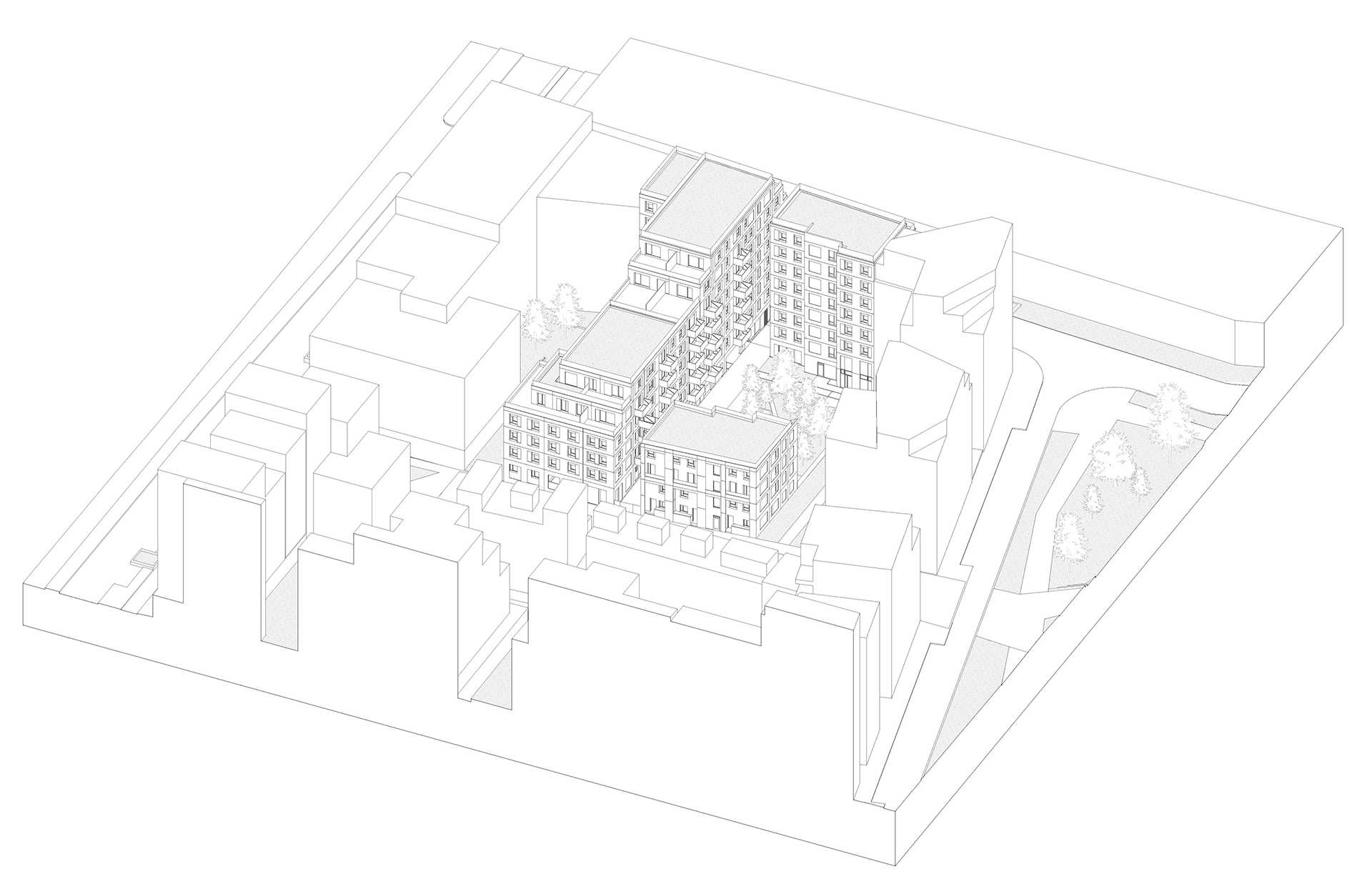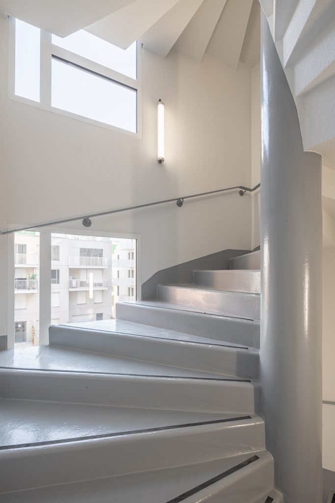 Finalement pour optimiser les apports solaires pour tous les logements, et pour les parcelles voisines, le bâtiment se développe en gradins, avec un épannelage variant du R+3 au R+7.