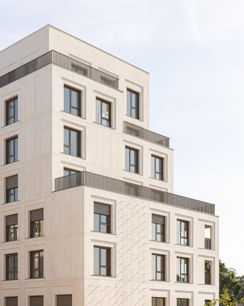 Dans l’idée que le parcours architectural valorise un logement et que la multiplicité des espaces transitoires menant au logement augmente la qualité de l’habitat, tectōne apporte un grand soin aux parties communes de l’immeuble, en les considérant comme de véritables espaces d’échanges et de cohésion sociale. Cela se matérialise dès la rue, par la mise en œuvre de deux passerelles qui enjambent une noue paysagère en creux, et qui constituent un premier filtre pour renforcer l’intimité des logements à rez-de-chaussée. La desserte des logements se fait ensuite au moyen de larges coursives extérieures, sorte de rue intérieure protégée, en dialogue avec l’espace public en contrebas, qui autorisent un usage libre par ses habitants.