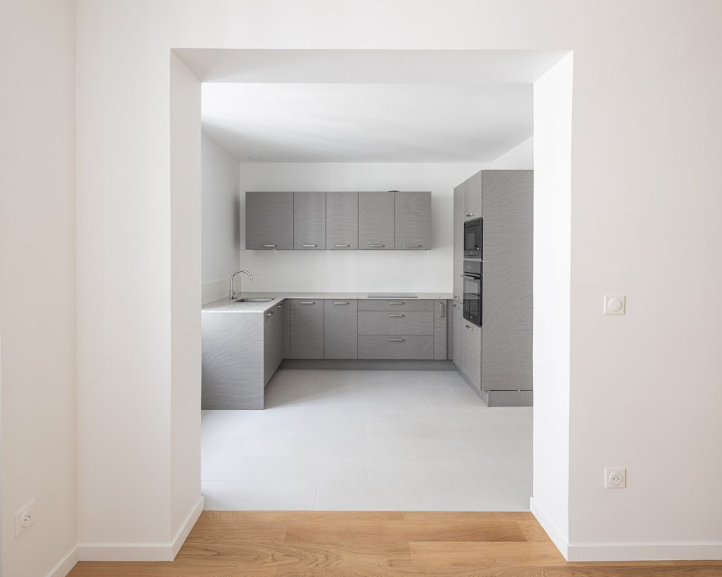 Cette restructuration s’est accompagnée d’une mise aux normes en électricité, sécurité incendie et accessibilité PMR (création d’un ascenseur), d’une rénovation énergétique (remplacement des châssis, isolation intérieure, remplacement sous-station CPCU), d’un ravalement et d’une recomposition des espaces extérieurs.