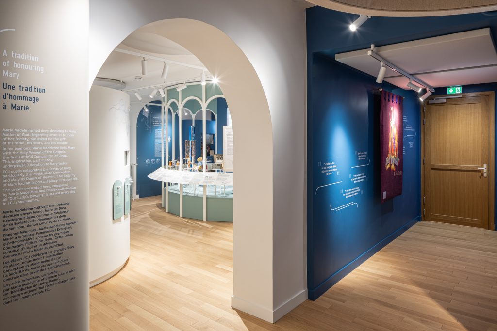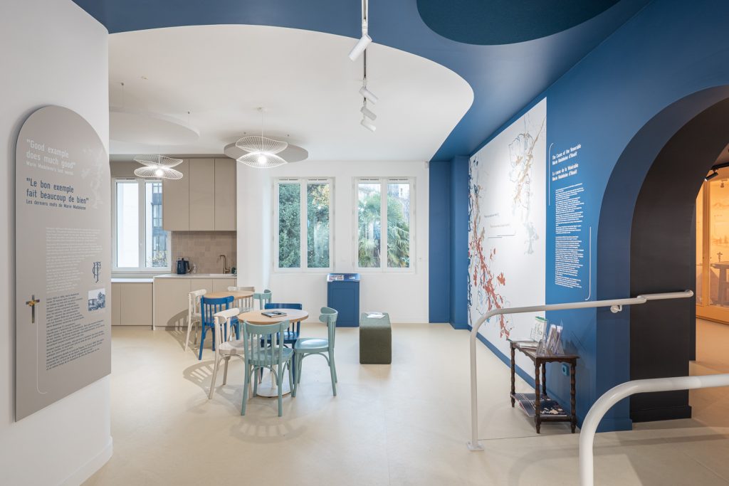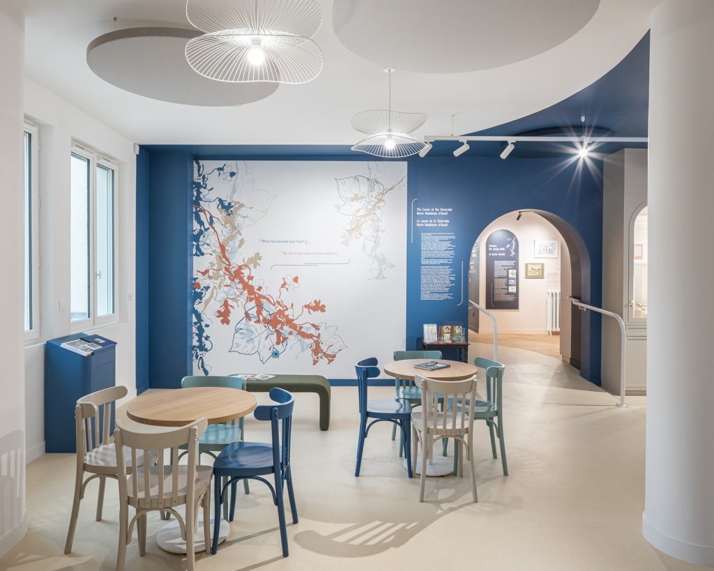 Côté congrégation, les espaces étaient vétustes et très cloisonnés ; la conception est repartie d’une page blanche sur les 4 niveaux. La définition du lieu d’exposition a fait l’objet d’un long travail pour proposer un cheminement fluide qui pourrait accueillir l’aménagement scénographique. Des cloisons sont tombées, des ouvertures notamment cintrées ont été créées. Les formes courbes ont trouvé naturellement leur place dans le projet, dans le bâtiment comme dans les espaces extérieurs.